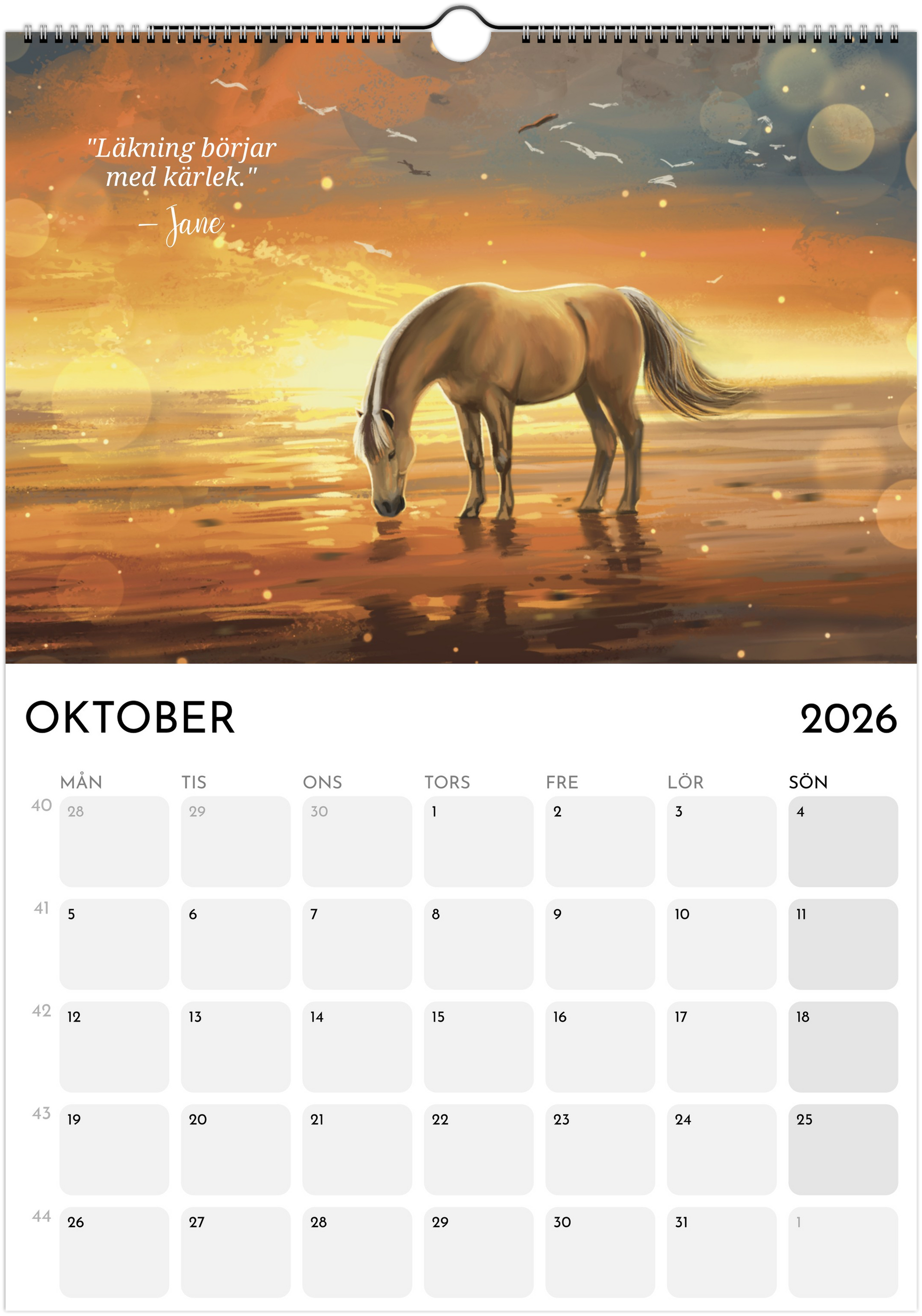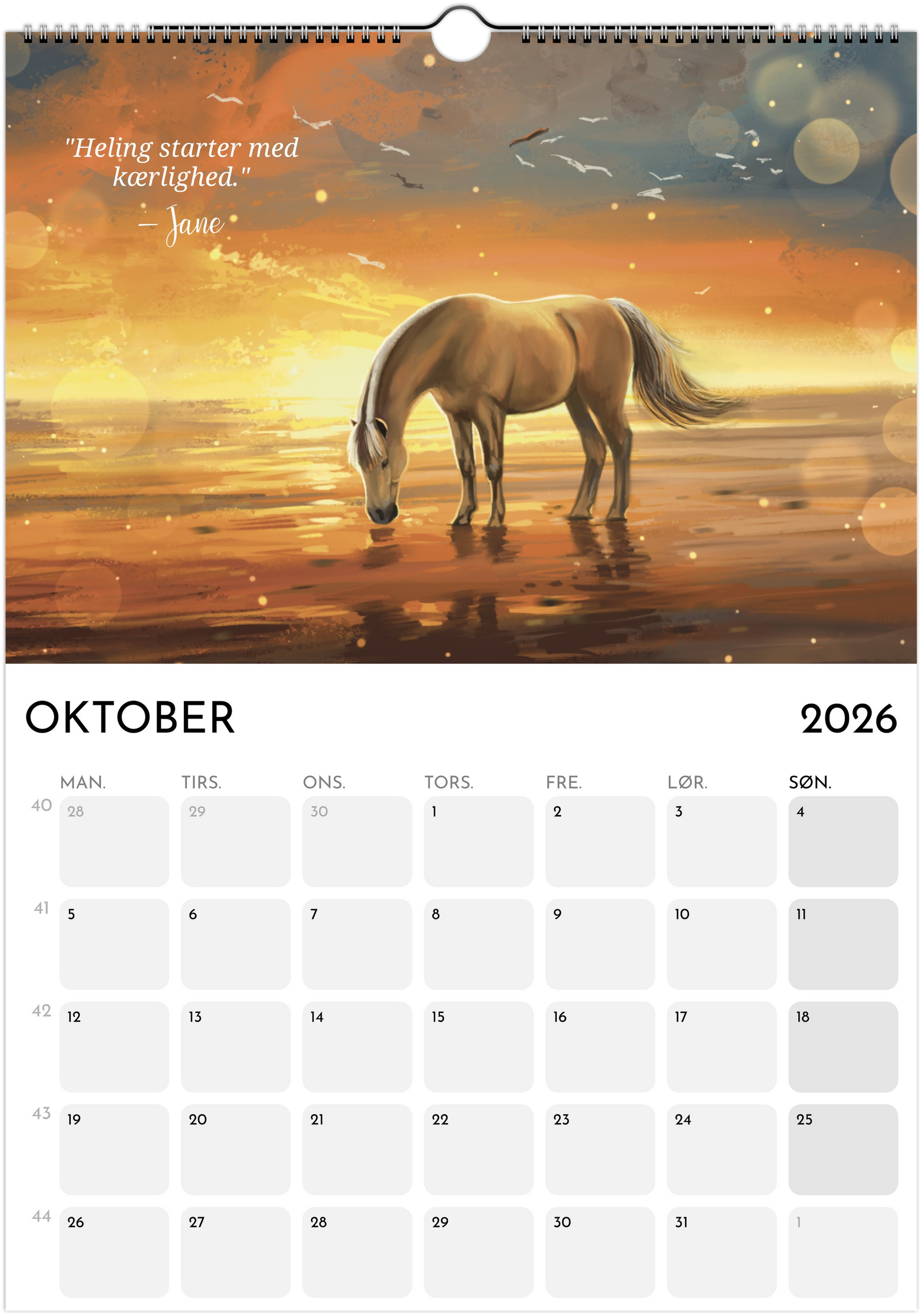 Kalenderen er trykt på eksklusivt 250 gsm semi-gloss silkepapir og har en praktisk ophængsbøjle, så den er nem at hænge op. Perfekt at placere, hvor du kan se den hver dag, og lade hestenes nærvær følge dig året rundt.