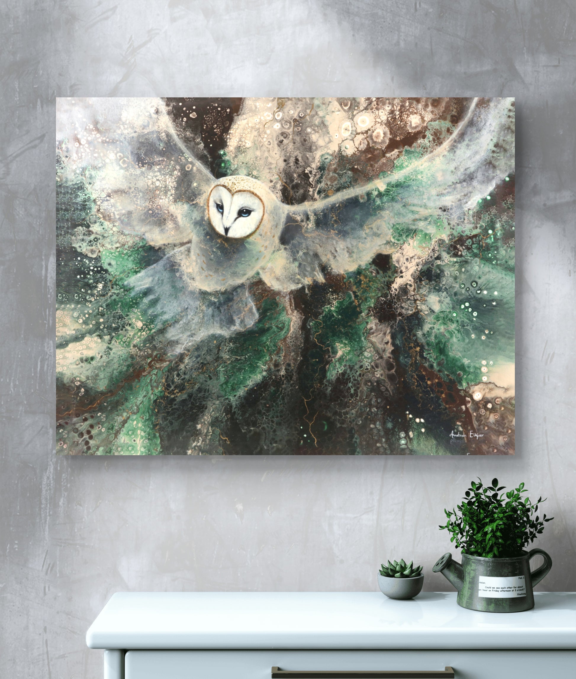 Dette maleri er et unikt samarbejde mellem Monnique Art og Anastasia Elkjær Art. Monnique har skabt baggrunden i sin karakteristiske fluid art stil, mens Anastasias oliemaleriske penselstrøg bringer sneuglen til live med elegance og dybde.